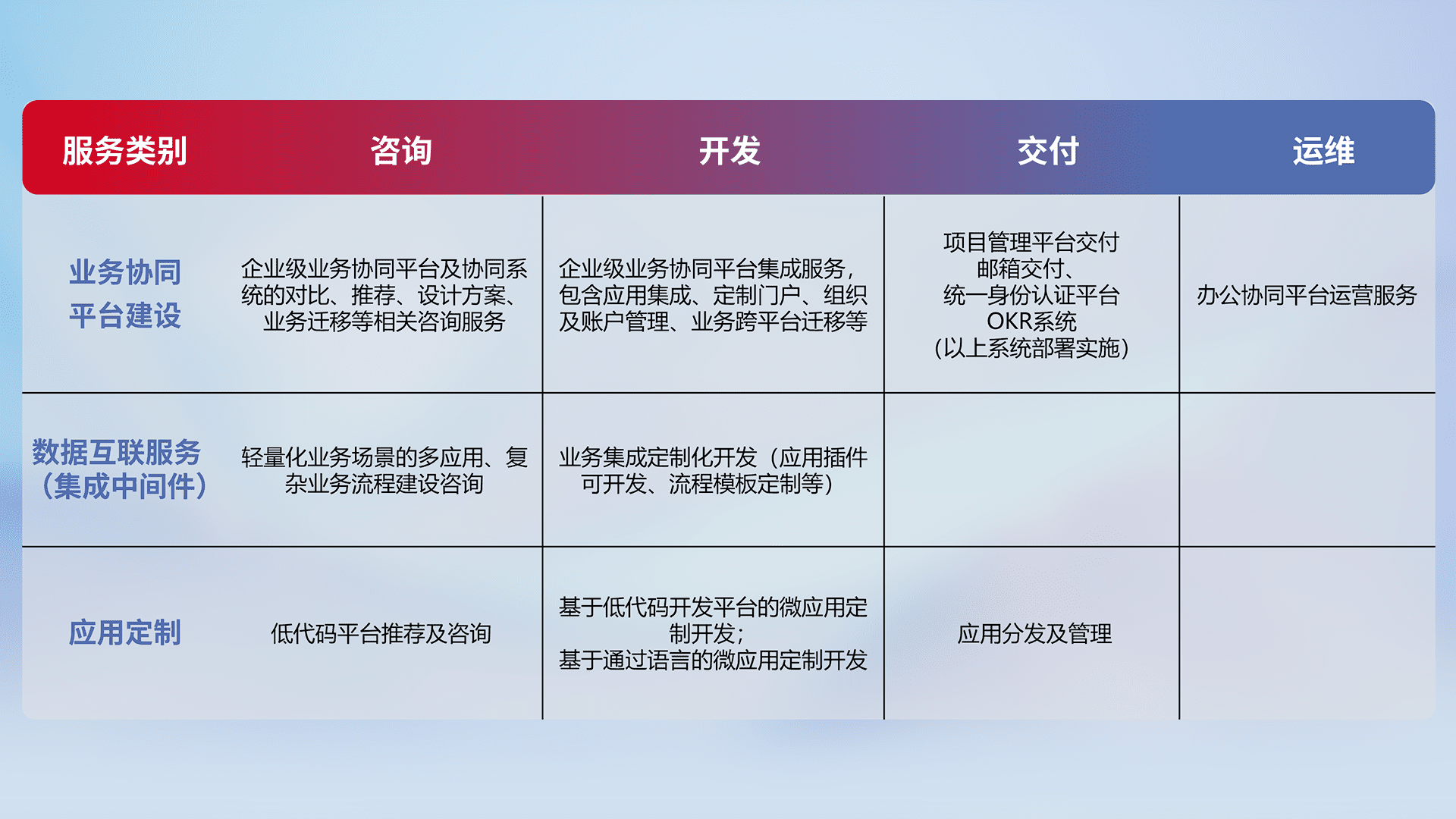针对钉钉、、、、企微、、、IDaas等平台级产品提供产品的规划、、、方案、、交付、、、、定制化开发等服务,,,实现如统一协同办公、、、智能客户服务、、、、混合会议管理、、、智能数据查询、、等业务场景,,,实现数字化转型。。